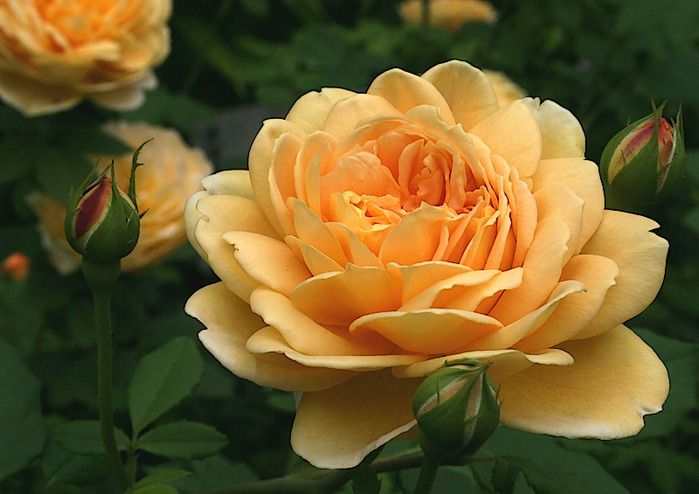Эта английская роза отличается крупными, шаровидными цветками, которые изящно свисают на ветвях. Цвет лепестков медно-желтый, что является редкостью для английских роз. При детальном рассмотрении можно заметить множество мелких розовых точек на насыщенно-желтом фоне, создающих уникальный эффект. Аромат цветков сильный и приятный. Роза обладает высокой устойчивостью к заболеваниям, что делает её превосходным выбором для любого сада. Этот сорт, созданный Дэвидом Остином, быстро растет и формирует крупный куст. При правильном уходе цветет обильно и продолжительно. В жарком климате может выращиваться как невысокая плетистая роза.