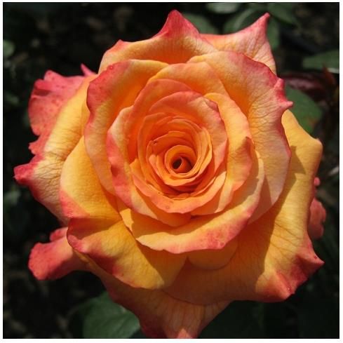 Великолепные насыщенно-желтые цветы с уникальным розовым обрамлением по краям лепестков создают потрясающий контраст с глянцевыми зелеными листьями. Цветы крупные, классической формы, с высоким центром и слегка закрученными наружу лепестками. Кусты высокие, прямостоячие, с небольшим количеством шипов.