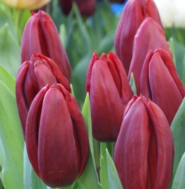Цветки у тюльпана Стронг Лав имеют бокаловидную форму и нежные, гладкие лепестки. Они не махровые, а их основной цвет – красновато-малиновый с глянцевым блеском. На солнце бутоны приобретают гранатовый оттенок. Диаметр цветка составляет 7,5-8 см, а длина – около 9 см.